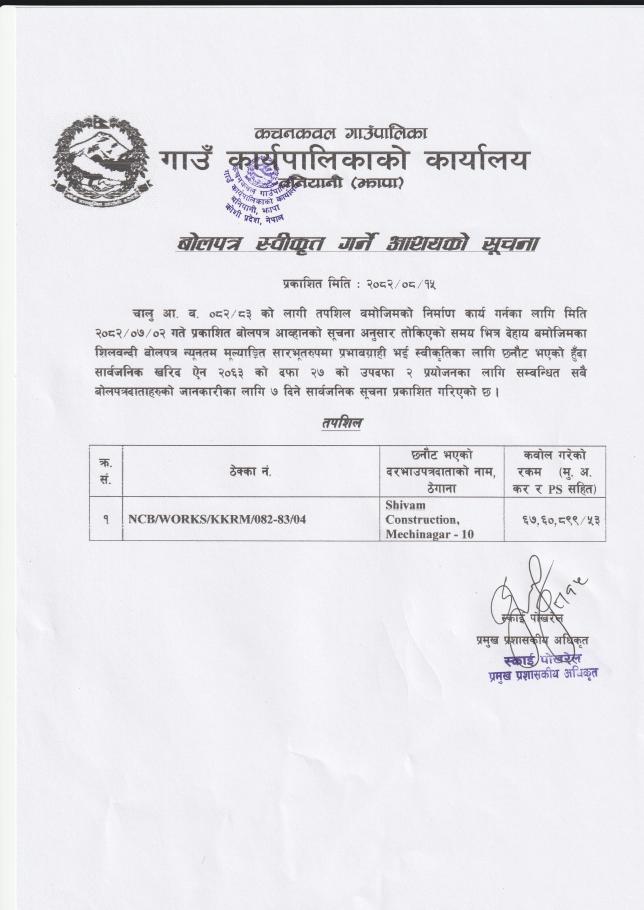 / बोलपत्र स्वीकृत गर्ने आशयको सुचना । | कचनकवल गाउँपालिका, गाउँ कार्यपालिकाको कार्यालय