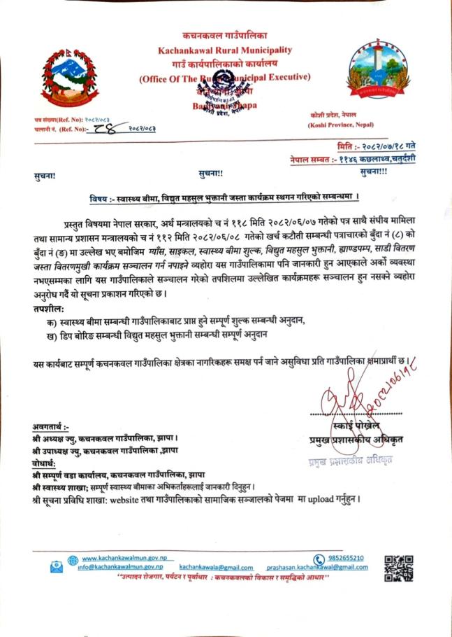 / स्वास्थ्य बीमा, विद्युत महसूल भुक्तानी जस्ता कार्यक्रम स्थगन गरिएको सम्बन्धमा । | कचनकवल गाउँपालिका, गाउँ कार्यपालिकाको कार्यालय