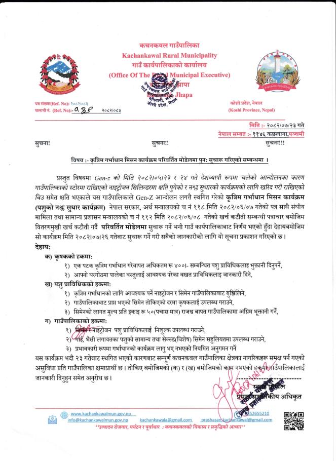 / कृत्रिम गर्भाधान मिसन कार्यक्रम परिवर्तित मोडेलमा पुन:सुचारु गरिएको सम्बन्धमा । | कचनकवल गाउँपालिका, गाउँ कार्यपालिकाको कार्यालय