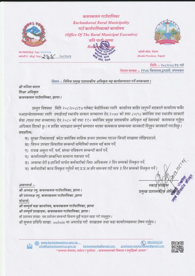 / निमित्त प्रमुख प्रशासकीय अधिकृत भइ कार्यसम्पादन गर्ने सम्बन्धमा । | कचनकवल गाउँपालिका, गाउँ कार्यपालिकाको कार्यालय
