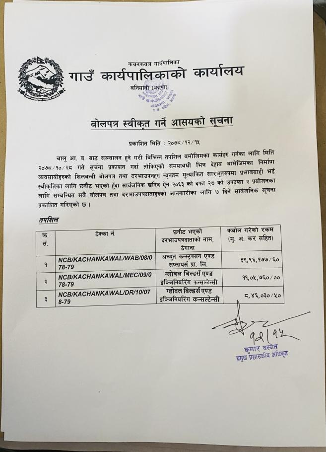 / बोलपत्र स्वीकृत गर्ने आसयको सूचना | | कचनकवल गाउँपालिका, गाउँ कार्यपालिकाको कार्यालय
