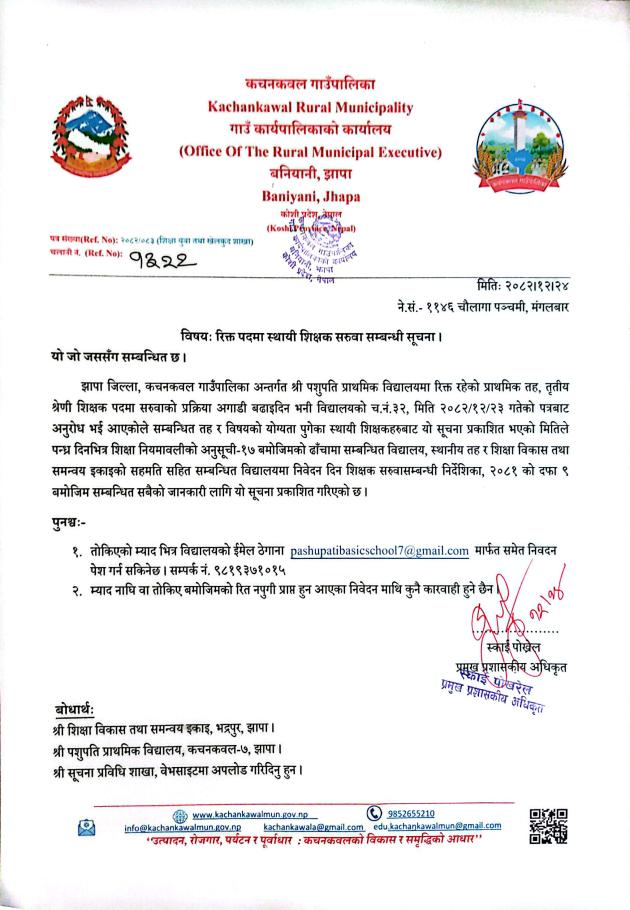 / रिक्त पदमा स्थायी शिक्षक सरुवा सम्बन्धी सूचना । | कचनकवल गाउँपालिका, गाउँ कार्यपालिकाको कार्यालय
